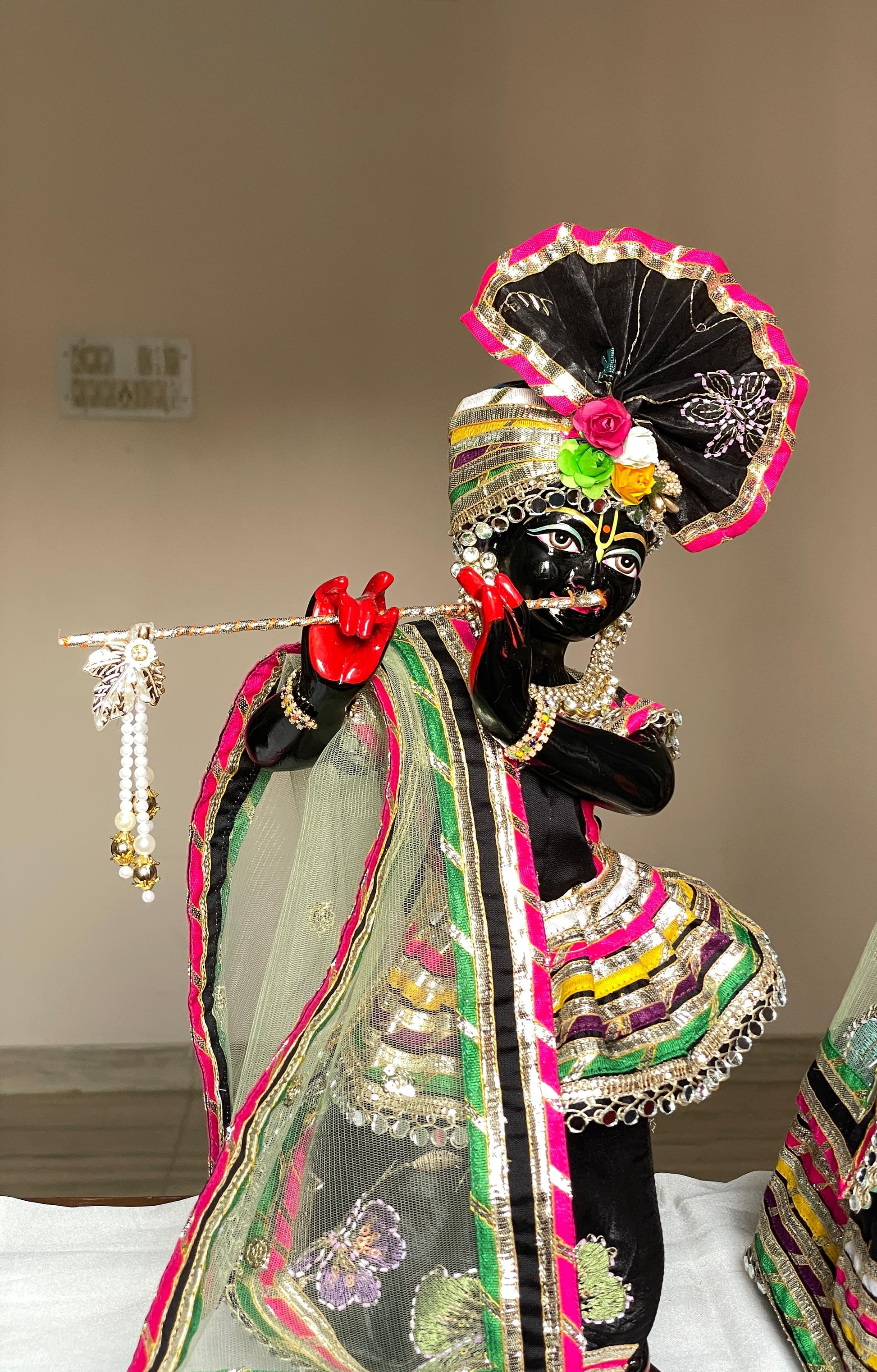Introduce a vibrant new look to your winter seva with the "Festive Fusion Black Silk Dress." This bold and beautiful set utilizes the luxurious drape and deep sheen of Black Silk, making the colorful accents truly pop. The outfit is richly embellished with detailed Hand Embroidery featuring delicate floral motifs, and is dramatically bordered with shimmering ribbons in fuchsia, emerald green, and gold. The contrast is stunning, offering a sophisticated, modern, and high-fashion choice for dressing your beloved Deities this winter season.โค๏ธ