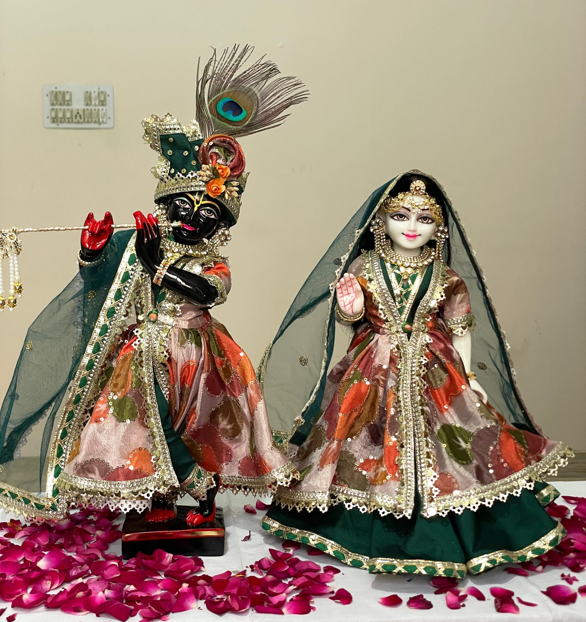 Adorn your beloved deities in the captivating Vanmali Ritu Poshak, a testament to exquisite handwork on luxurious silk. This unique dress features a mesmerizing blend of earthy tones—from warm terracotta and deep rust to soft moss green and gentle beige—creating a tapestry of colors reminiscent of changing seasons. Each garment is richly embellished with sparkling sequins and intricate zari work, catching the light with every movement. Framed by a rich, deep emerald-green border, this outfit ensures Radha and Krishna radiate a distinctive artistic charm and divine splendor, perfect for special occasions and elevating your daily shringar.. ✨